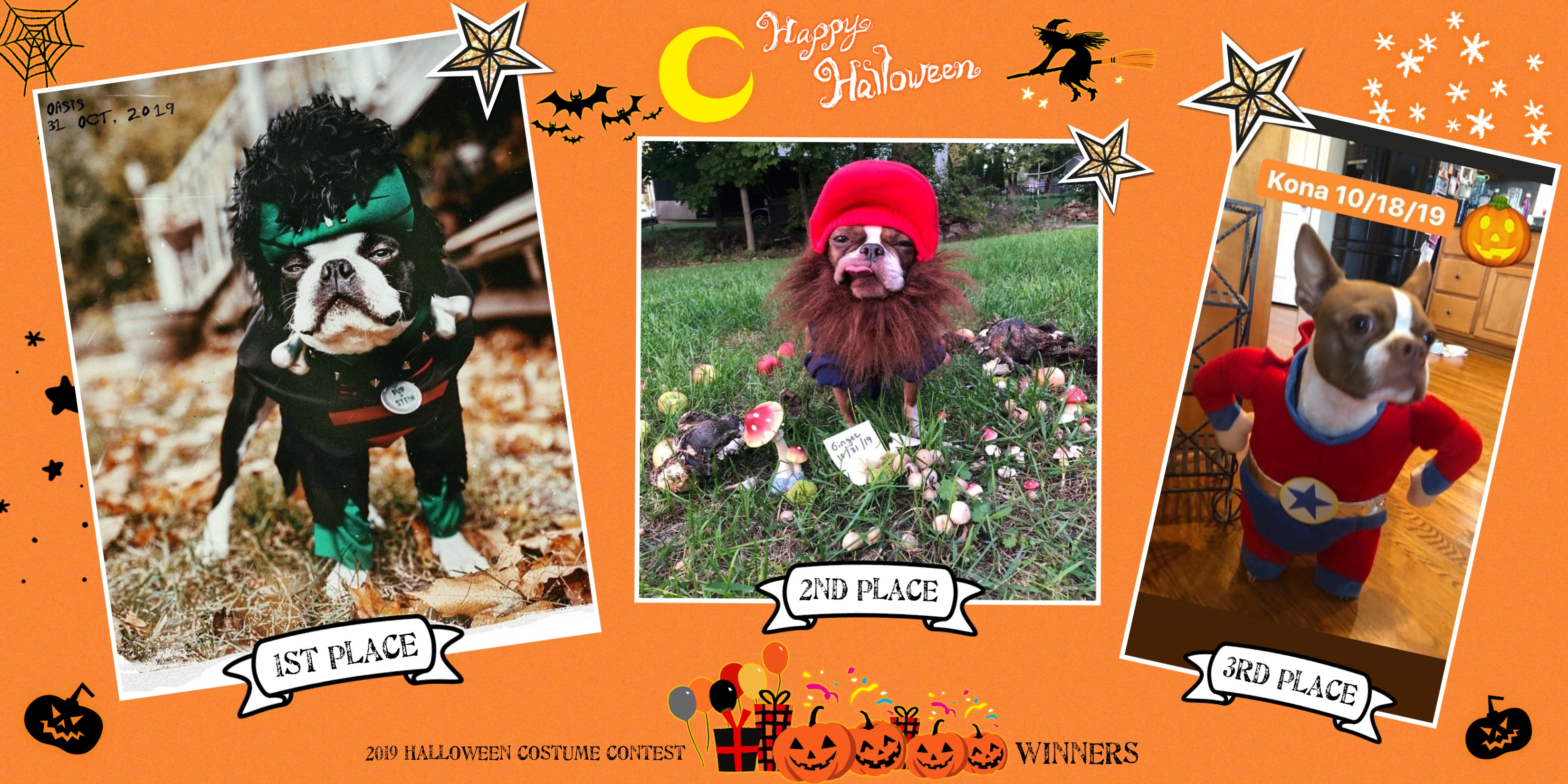 - Your boston terrier dressed up for Halloween w/ their first name & dated 10/31/2019 in the picture.